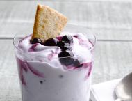 Разпределете в чаши, отгоре сипете от боровинковата смес и сервирайте с бисквити.