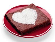 Разрежете браунито на квадратчета (или на сърчица). Отгоре направете сърчица от пудра захар.
