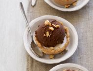 Върху всяка чашка слагайте по лъжичка шоколадов сладолед. Поръсете с натрошени лешници и сервирайте.