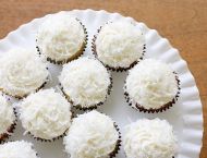 Междувременно направете глазурата. С миксер разбийте на ниска скорост крем сиренето и маслото с ароматите. Добавете пудрата захар и разбивайте до гладка смес. Поръсете с останалия кокос.