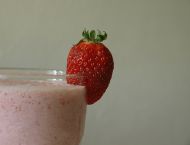 Разбийте ги с пасатор или в блендер и добавете сладоледа и млякото. Разбийте отново. Сервирайте във високи чаши със сламка и украсете със свежи ягоди.