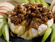 Поставете бри върху форма за блат (или друга удобна) и печете, докато омекне – 4-5 минути. Покрийте със захарната смес и върнете във фурната за още 2-3 минути, докато се разтопи захарта.