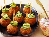 Нарежете боровинките на ситно и ги смесете със сметаната и копъра. Аранжирайте всяко кюфтенце с краставичка и сервирайте със сметановия сос.