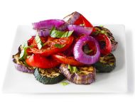 Загрейте скарата или котлона (ако ще използвате грил тиган) на средна температура и печете – доматите около 6 минути; чушката, лука и тиквичката – 8, патладжана – 10 минути.