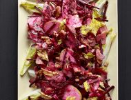 Нарежете ябълките на тънко. Нарежете лука и изцедете лимона. Смесете всичко. Добавете и беленото и настъргано цвекло. Поръсете с 1 лъжица захар, наситнените орехи, зехтина и солта.