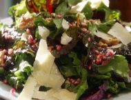 Сложете горчицата при медено-оцетената смес и разбъркайте. Добавете зехтин. Изсипете върху салатата. Добавете сол и поръсете с орехи, семена нар, пармезан и може да добави лук.