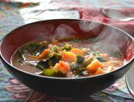 Задушете лука и чесъна в зехтин до златисто. Сипете бульона и добавтее всички твъди зеленчуци като картофите, морковите, ряпата. Добавете мащерката.