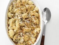 Смесете сметаната, горчицата и солта и полейте карфиола. Отгоре поръсете настърган грюер и галета.