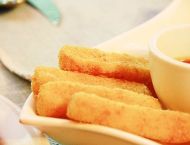Потапяйте пръчиците в брашно, после в яйцата и накрая в галетата. И още веднъж – потапяйте ги отново в яйцата и пак в галетата.
