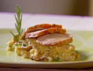 В голям тиган нагорещете зехтин и запечатайте филето от всички страни за по около минута. Прехвърлете филето в тава за печене и печете до готовност. Сервирайте нарязано на филйки с ризото и стрък розмарин.